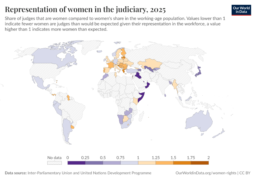 “Data Page: Representation of women in the judiciary”. Our World in Data (2026). Data adapted from Inter-Parliamentary Union and United Nations Development Programme. Retrieved from https://gfs-wave-2-new.owid.pages.dev:8789/20260304-094028/grapher/representation-of-women-in-the-judiciary.html [online resource] (archived on March 4, 2026).How to cite this data