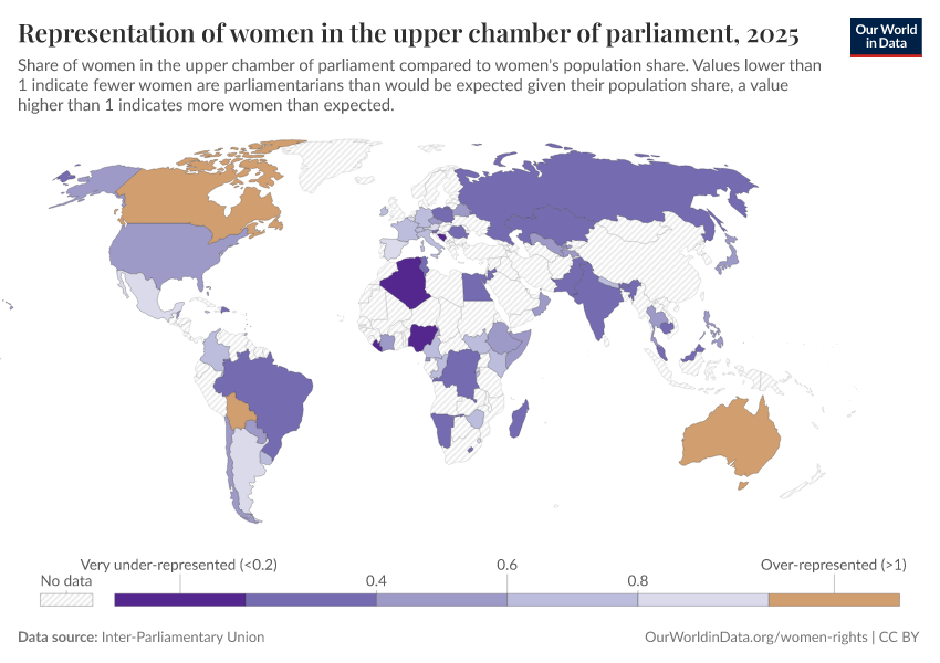 “Data Page: Representation of women in the upper chamber of parliament”. Our World in Data (2026). Data adapted from Inter-Parliamentary Union. Retrieved from https://gfs-wave-2-new.owid.pages.dev:8789/20260304-094028/grapher/representation-of-women-in-the-upper-chamber-of-parliament.html [online resource] (archived on March 4, 2026).How to cite this data