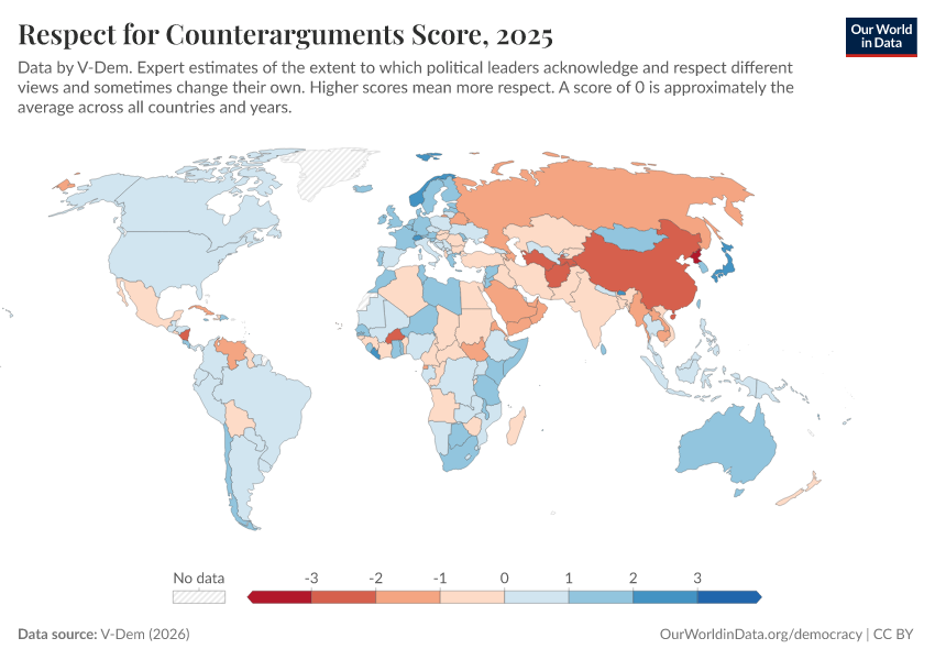 “Data Page: Respect for counterarguments”, part of the following publication: Bastian Herre, Lucas Rodés-Guirao, and Esteban Ortiz-Ospina (2013) - “Democracy”. Data adapted from V-Dem. Retrieved from https://gfs-wave-2-new.owid.pages.dev:8789/20260402-164039/grapher/respect-for-counterarguments-score.html [online resource] (archived on April 2, 2026).How to cite this data