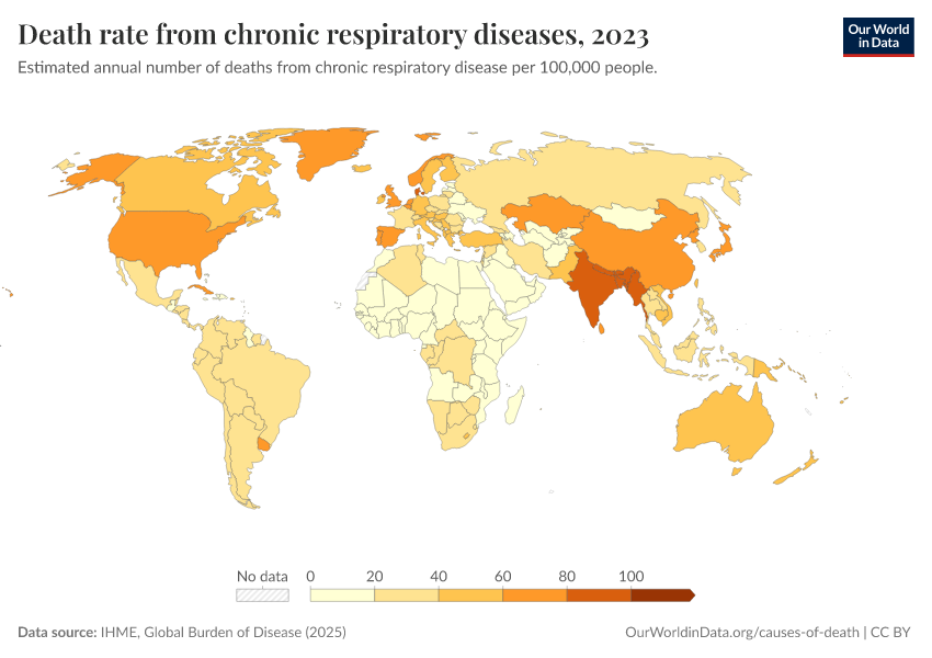“Data Page: Death rate from chronic respiratory diseases”, part of the following publication: Esteban Ortiz-Ospina and Max Roser (2016) - “Global Health”. Data adapted from IHME, Global Burden of Disease. Retrieved from https://gfs-wave-2-new.owid.pages.dev:8789/20260323-161325/grapher/respiratory-disease-death-rate-gbd.html [online resource] (archived on March 23, 2026).How to cite this data