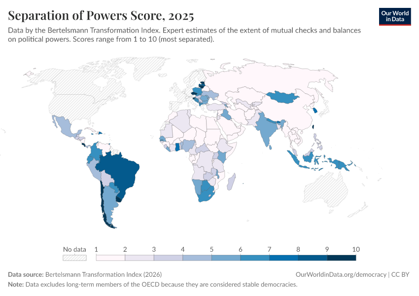 “Data Page: Separation of Powers Score”, part of the following publication: Bastian Herre, Lucas Rodés-Guirao, and Esteban Ortiz-Ospina (2013) - “Democracy”. Data adapted from Bertelsmann Transformation Index. Retrieved from https://gfs-wave-2-new.owid.pages.dev:8789/20260327-184752/grapher/separation-of-powers-score-bti.html [online resource] (archived on March 27, 2026).How to cite this data