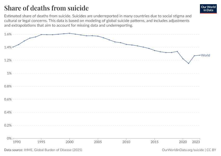 “Data Page: Share of deaths from suicide”, part of the following publication: Esteban Ortiz-Ospina and Max Roser (2016) - “Global Health”. Data adapted from IHME, Global Burden of Disease. Retrieved from https://gfs-wave-2-new.owid.pages.dev:8789/20260323-161325/grapher/share-deaths-suicide.html [online resource] (archived on March 23, 2026).