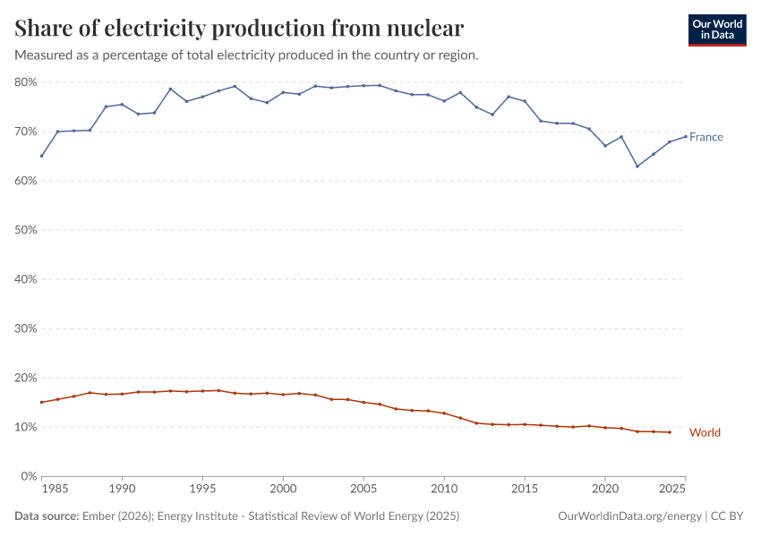Ember (2026); Energy Institute - Statistical Review of World Energy (2025) – with major processing by Our World in Data. “Share of electricity generated by nuclear power” [dataset]. Ember, “Yearly Electricity Data Europe”; Ember, “Yearly Electricity Data”; Energy Institute, “Statistical Review of World Energy” [original data]. Retrieved April 10, 2026 from https://gfs-wave-2-new.owid.pages.dev:8789/20260304-094028/grapher/share-electricity-nuclear.html (archived on March 4, 2026).Download