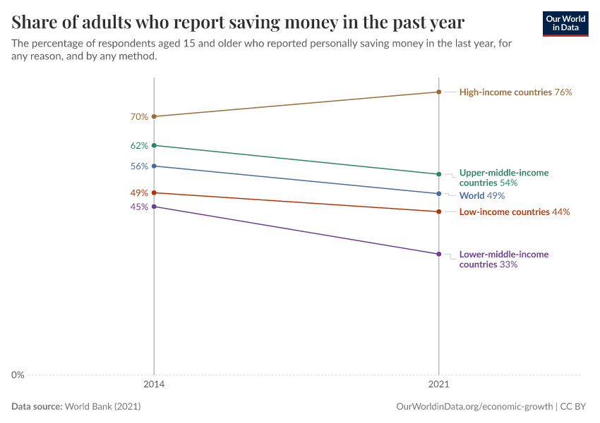 “Data Page: Share of adults who report saving money in the past year”, part of the following publication: Max Roser, Bertha Rohenkohl, Pablo Arriagada, Joe Hasell, Hannah Ritchie, and Esteban Ortiz-Ospina (2023) - “Economic Growth”. Data adapted from World Bank. Retrieved from https://gfs-wave-2-new.owid.pages.dev:8789/20260304-094028/grapher/share-of-adults-who-report-saving-money-in-the-past-year.html [online resource] (archived on March 4, 2026).How to cite this data