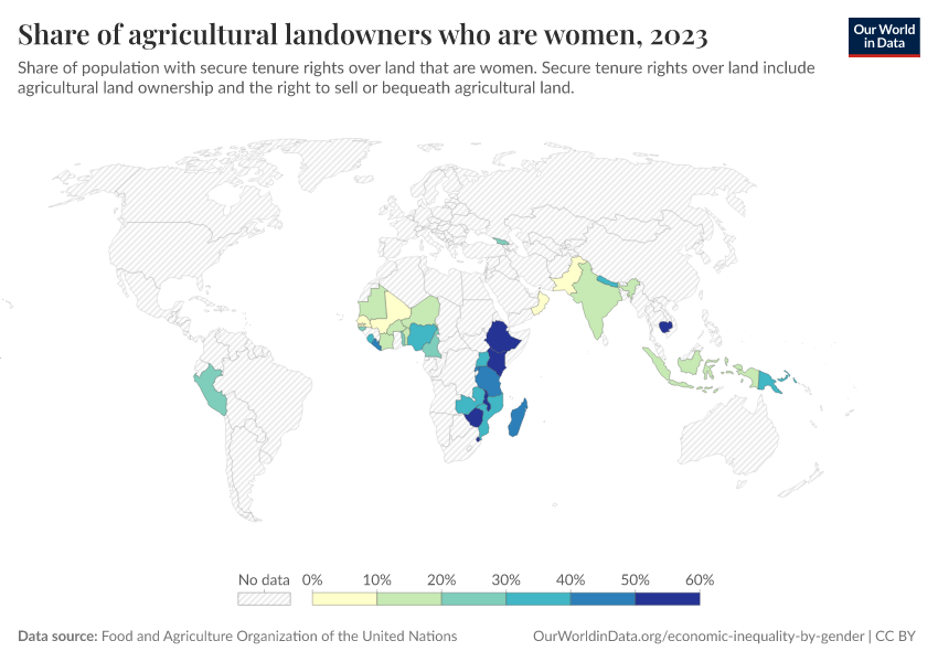 “Data Page: Share of agricultural landowners who are women”. Our World in Data (2026). Data adapted from Food and Agriculture Organization of the United Nations. Retrieved from https://gfs-wave-2-new.owid.pages.dev:8789/20260304-094028/grapher/share-of-agricultural-land-owners-that-are-women.html [online resource] (archived on March 4, 2026).How to cite this data