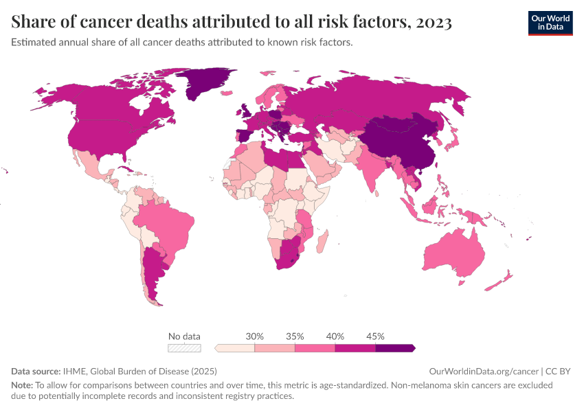 “Data Page: Share of cancer deaths attributed to all risk factors”, part of the following publication: Esteban Ortiz-Ospina and Max Roser (2016) - “Global Health”. Data adapted from IHME, Global Burden of Disease. Retrieved from https://gfs-wave-2-new.owid.pages.dev:8789/20260319-175416/grapher/share-of-cancer-deaths-attributed-to-all-risk-factors.html [online resource] (archived on March 19, 2026).How to cite this data