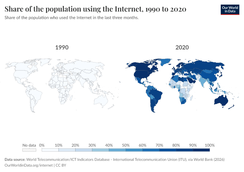 World Telecommunication/ICT Indicators Database - International Telecommunication Union (ITU), via World Bank (2026) – with minor processing by Our World in Data. “Share of the population using the Internet – International Telecommunication Union” [dataset]. World Telecommunication/ICT Indicators Database - International Telecommunication Union (ITU), via World Bank, “World Development Indicators 125” [original data]. Retrieved April 10, 2026 from https://gfs-wave-2-new.owid.pages.dev:8789/20260304-094028/grapher/share-of-individuals-using-the-internet.html (archived on March 4, 2026).Download