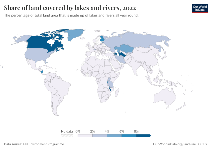 “Data Page: Share of land covered by lakes and rivers”. Our World in Data (2026). Data adapted from UN Environment Programme. Retrieved from https://gfs-wave-2-new.owid.pages.dev:8789/20260304-094028/grapher/share-of-land-covered-by-lakes-and-rivers.html [online resource] (archived on March 4, 2026).How to cite this data