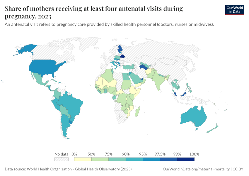 World Health Organization - Global Health Observatory (2025) – processed by Our World in Data. “Share of mothers receiving at least four antenatal visits during pregnancy” [dataset]. World Health Organization, “Global Health Observatory” [original data]. Retrieved April 10, 2026 from https://gfs-wave-2-new.owid.pages.dev:8789/20260304-094028/grapher/share-of-mothers-receiving-at-least-four-antenatal-visits-during-pregnancy.html (archived on March 4, 2026).Download