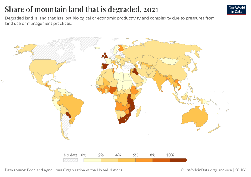 “Data Page: Share of mountain land that is degraded”. Our World in Data (2026). Data adapted from Food and Agriculture Organization of the United Nations. Retrieved from https://gfs-wave-2-new.owid.pages.dev:8789/20260304-094028/grapher/share-of-mountain-land-that-is-degraded.html [online resource] (archived on March 4, 2026).How to cite this data