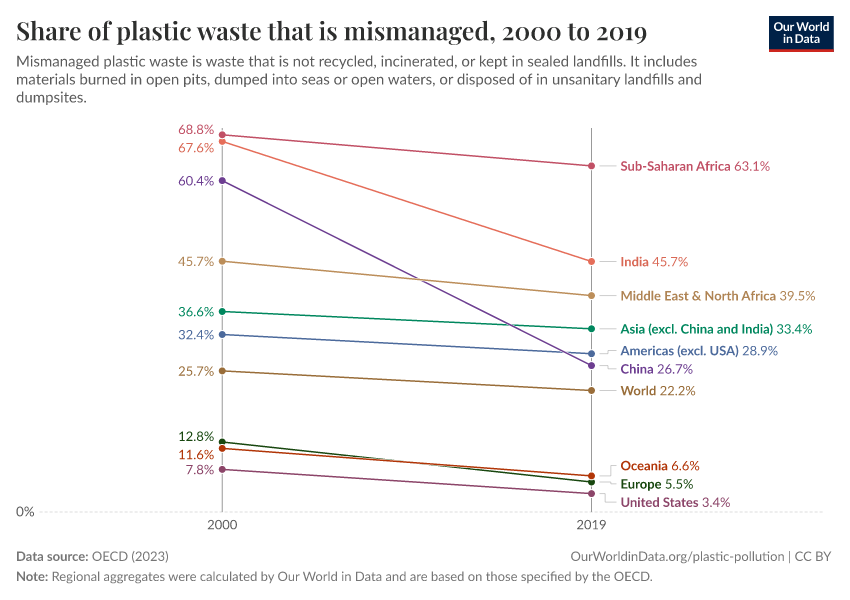 OECD (2023) – processed by Our World in Data. “Share of plastic waste that is mismanaged” [dataset]. OECD, “Global Plastics Outlook - Plastics waste by region and end-of-life fate” [original data]. Retrieved April 10, 2026 from https://gfs-wave-2-new.owid.pages.dev:8789/20260304-094028/grapher/share-of-plastic-waste-that-is-mismanaged.html (archived on March 4, 2026).Download