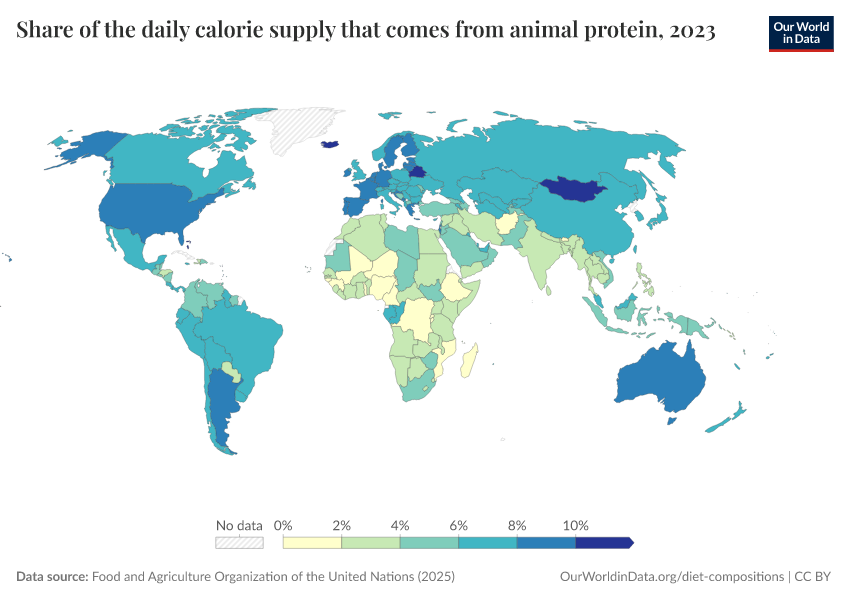 “Data Page: Share of the daily calorie supply that comes from animal protein”, part of the following publication: Hannah Ritchie, Pablo Rosado, and Max Roser (2023) - “Agricultural Production”. Data adapted from Food and Agriculture Organization of the United Nations. Retrieved from https://gfs-wave-2-new.owid.pages.dev:8789/20260402-173937/grapher/share-of-the-daily-calorie-supply-that-comes-from-animal-protein.html [online resource] (archived on April 2, 2026).How to cite this data