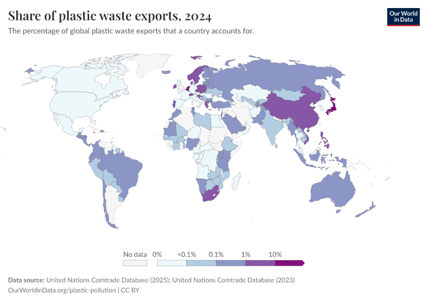 United Nations Comtrade Database (2025); United Nations Comtrade Database (2023) – with major processing by Our World in Data. “Share of plastic waste exports” [dataset]. United Nations Comtrade Database, “Comtrade Database” [original data]. Retrieved April 10, 2026 from https://gfs-wave-2-new.owid.pages.dev:8789/20260304-094028/grapher/share-plastic-waste-exports.html (archived on March 4, 2026).Download