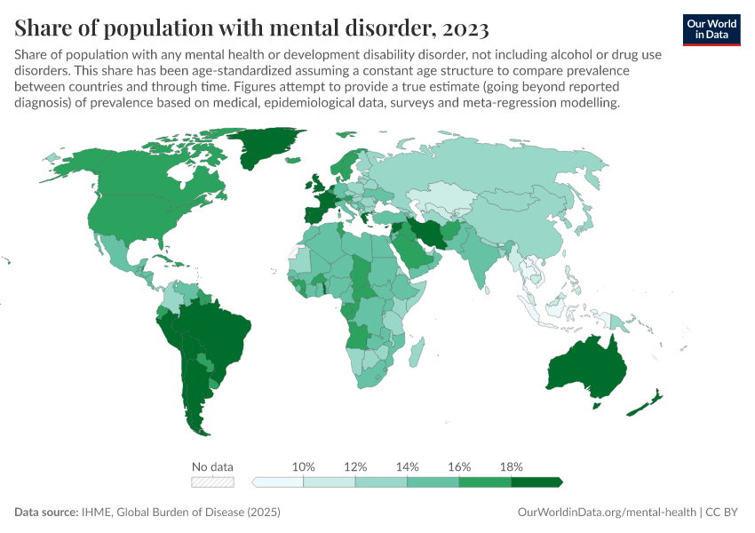 “Data Page: Share of population with mental disorder”, part of the following publication: Saloni Dattani, Lucas Rodés-Guirao, Hannah Ritchie, and Max Roser (2023) - “Mental Health”. Data adapted from IHME, Global Burden of Disease. Retrieved from https://gfs-wave-2-new.owid.pages.dev:8789/20260319-181852/grapher/share-with-mental-health-or-development-disorder.html [online resource] (archived on March 19, 2026).How to cite this data