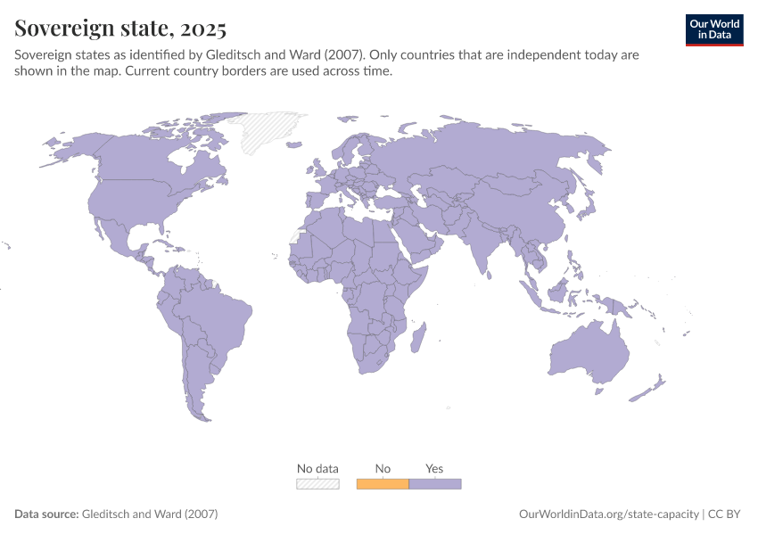 “Data Page: Sovereign state”, part of the following publication: Bastian Herre and Pablo Arriagada (2023) - “State Capacity”. Data adapted from Gleditsch and Ward. Retrieved from https://gfs-wave-2-new.owid.pages.dev:8789/20260304-094028/grapher/sovereign-state-gleditsch-ward.html [online resource] (archived on March 4, 2026).How to cite this data