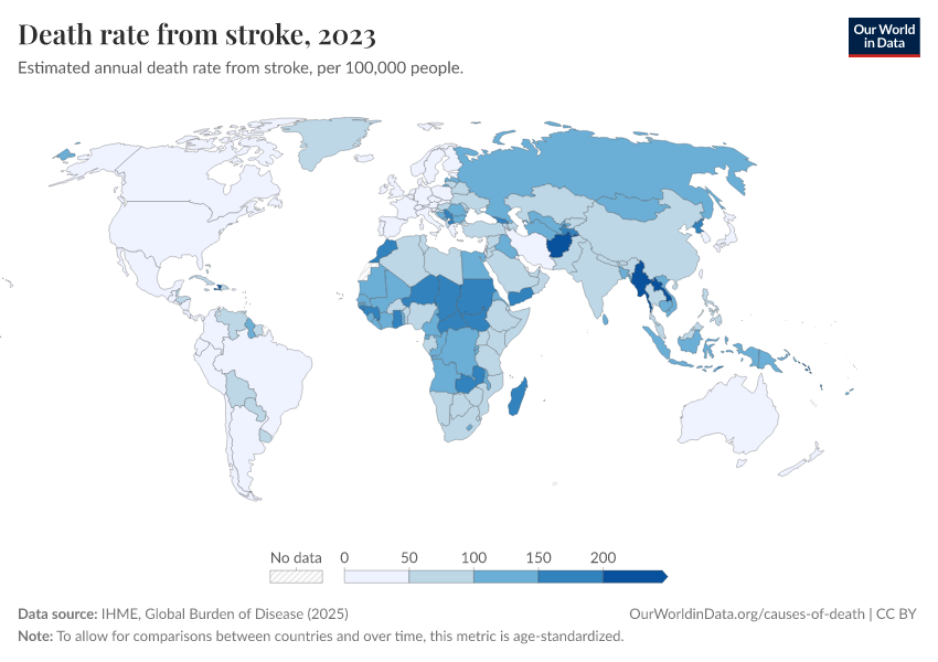 IHME, Global Burden of Disease (2025) – with major processing by Our World in Data. “Death rate from stroke – IHME” [dataset]. IHME, Global Burden of Disease, “Global Burden of Disease - Deaths” [original data]. Retrieved April 10, 2026 from https://gfs-wave-2-new.owid.pages.dev:8789/20260323-161325/grapher/stroke-death-rates.html (archived on March 23, 2026).