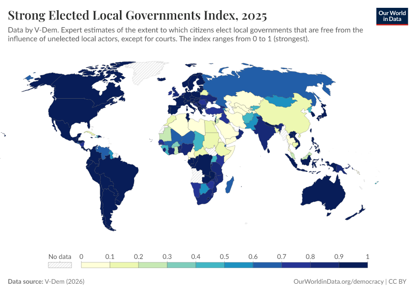 “Data Page: Elected local governments”, part of the following publication: Bastian Herre, Lucas Rodés-Guirao, and Esteban Ortiz-Ospina (2013) - “Democracy”. Data adapted from V-Dem. Retrieved from https://gfs-wave-2-new.owid.pages.dev:8789/20260402-164039/grapher/strong-elected-local-governments-index.html [online resource] (archived on April 2, 2026).How to cite this data