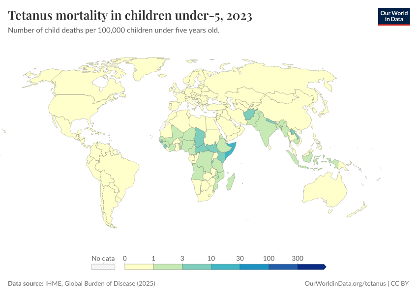 IHME, Global Burden of Disease (2025) – with major processing by Our World in Data. “Tetanus mortality in children under-5 – IHME” [dataset]. IHME, Global Burden of Disease, “Global Burden of Disease - Deaths” [original data]. Retrieved April 10, 2026 from https://gfs-wave-2-new.owid.pages.dev:8789/20260323-161325/grapher/tetanus-mortality-in-children-under-5.html (archived on March 23, 2026).