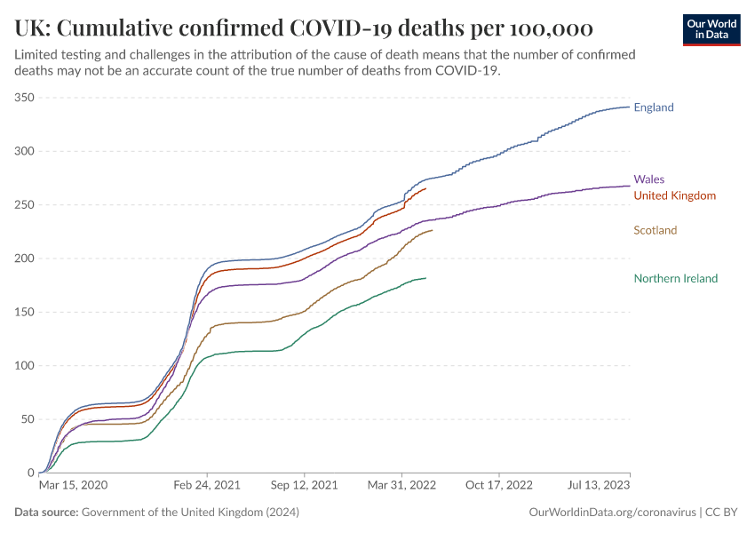 Government of the United Kingdom (2024) – with minor processing by Our World in Data. “UK: Cumulative confirmed COVID-19 deaths per 100,000” [dataset]. Government of the United Kingdom, “UKHSA data dashboard” [original data]. Retrieved April 10, 2026 from https://gfs-wave-2-new.owid.pages.dev:8789/20260304-094028/grapher/uk-cumulative-covid-deaths-rate.html (archived on March 4, 2026).Download