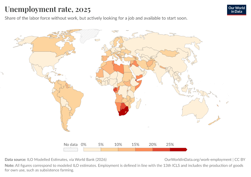 ILO Modelled Estimates, via World Bank (2026) – processed by Our World in Data. “Unemployment rate – ILO” [dataset]. ILO Modelled Estimates, via World Bank, “World Development Indicators 125” [original data]. Retrieved April 10, 2026 from https://gfs-wave-2-new.owid.pages.dev:8789/20260309-120101/grapher/unemployment-rate.html (archived on March 9, 2026).