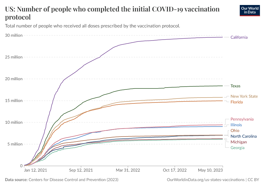 Centers for Disease Control and Prevention (2023) – processed by Our World in Data. “US: Number of people who completed the initial COVID-19 vaccination protocol” [dataset]. Centers for Disease Control and Prevention, “COVID-19, Vaccinations (United States)” [original data]. Retrieved April 10, 2026 from https://gfs-wave-2-new.owid.pages.dev:8789/20260304-094028/grapher/us-covid-number-fully-vaccinated.html (archived on March 4, 2026).Download