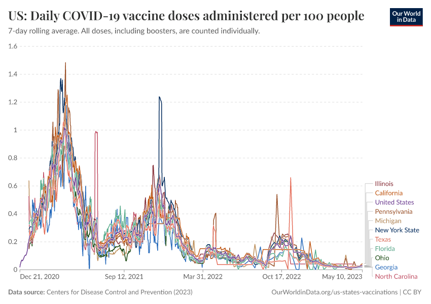 Centers for Disease Control and Prevention (2023) – processed by Our World in Data. “US: Daily COVID-19 vaccine doses administered per 100 people” [dataset]. Centers for Disease Control and Prevention, “COVID-19, Vaccinations (United States)” [original data]. Retrieved April 10, 2026 from https://gfs-wave-2-new.owid.pages.dev:8789/20260304-094028/grapher/us-daily-covid-vaccine-doses-per-100.html (archived on March 4, 2026).Download