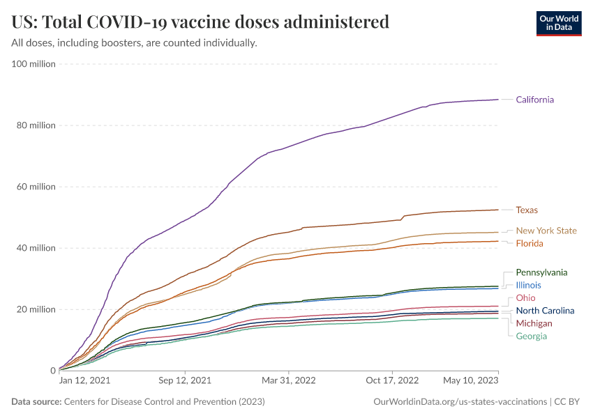 Centers for Disease Control and Prevention (2023) – processed by Our World in Data. “US: Total COVID-19 vaccine doses administered” [dataset]. Centers for Disease Control and Prevention, “COVID-19, Vaccinations (United States)” [original data]. Retrieved April 10, 2026 from https://gfs-wave-2-new.owid.pages.dev:8789/20260304-094028/grapher/us-total-covid-19-vaccine-doses-administered.html (archived on March 4, 2026).Download