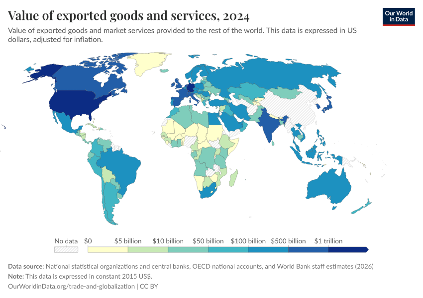 “Data Page: Value of exported goods and services”. Our World in Data (2026). Data adapted from National statistical organizations and central banks, OECD national accounts, and World Bank staff estimates. Retrieved from https://gfs-wave-2-new.owid.pages.dev:8789/20260304-094028/grapher/value-of-exported-goods-and-services.html [online resource] (archived on March 4, 2026).How to cite this data
