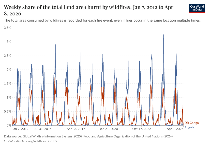 “Data Page: Weekly share of the total land area burnt by wildfires”, part of the following publication: Hannah Ritchie, Pablo Rosado, and Veronika Samborska (2024) - “Climate Change”. Data adapted from Global Wildfire Information System, Food and Agriculture Organization of the United Nations. Retrieved from https://gfs-wave-2-new.owid.pages.dev:8789/20260326-144924/grapher/weekly-share-of-the-total-land-area-burnt-by-wildfires.html [online resource] (archived on March 26, 2026).How to cite this data