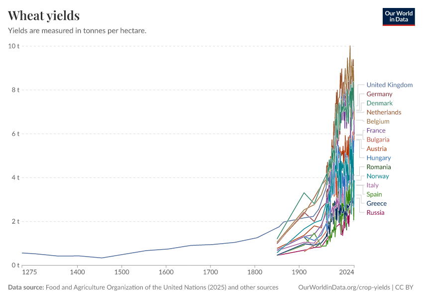 Food and Agriculture Organization of the United Nations (2025); Broadberry et al. (2015); Brassley (2000); Bayliss-Smith & Wanmali (1984) – with major processing by Our World in Data. “Wheat yields” [dataset]. Food and Agriculture Organization of the United Nations, “Production: Crops and livestock products”; Broadberry et al., “Long-term crop yields in UK”; Brassley, “Long-term crop yields in UK”; Bayliss-Smith & Wanmali, “Understanding Green Revolutions” [original data]. Retrieved April 10, 2026 from https://gfs-wave-2-new.owid.pages.dev:8789/20260304-110441/grapher/wheat-yields.html (archived on March 4, 2026).Download