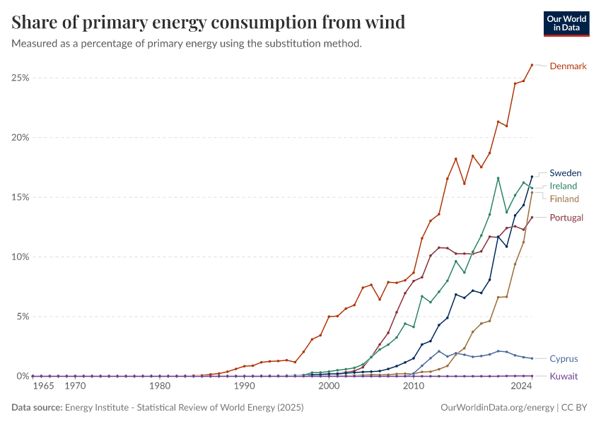 Energy Institute - Statistical Review of World Energy (2025) – with major processing by Our World in Data. “Share of primary energy consumption that comes from wind power – Using the substitution method” [dataset]. Energy Institute, “Statistical Review of World Energy” [original data]. Retrieved April 10, 2026 from https://gfs-wave-2-new.owid.pages.dev:8789/20260304-094028/grapher/wind-share-energy.html (archived on March 4, 2026).Download