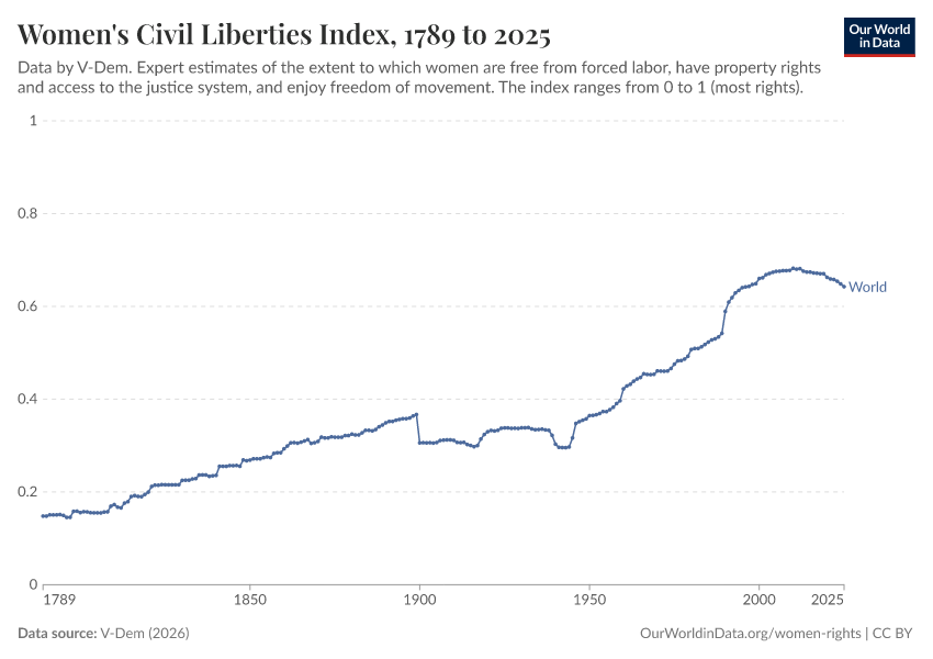 V-Dem (2026) – processed by Our World in Data. “Women's civil rights index – V-Dem” [dataset]. V-Dem, “Democracy report v16” [original data]. Retrieved April 10, 2026 from https://gfs-wave-2-new.owid.pages.dev:8789/20260402-164039/grapher/women-civil-liberties-index.html (archived on April 2, 2026).Download