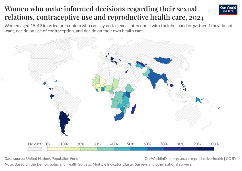 “Data Page: Women who make informed decisions regarding their sexual relations, contraceptive use and reproductive health care”. Our World in Data (2026). Data adapted from United Nations Population Fund. Retrieved from https://gfs-wave-2-new.owid.pages.dev:8789/20260304-094028/grapher/women-informed-decisions-health-sexual-relations.html [online resource] (archived on March 4, 2026).How to cite this data
