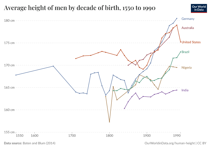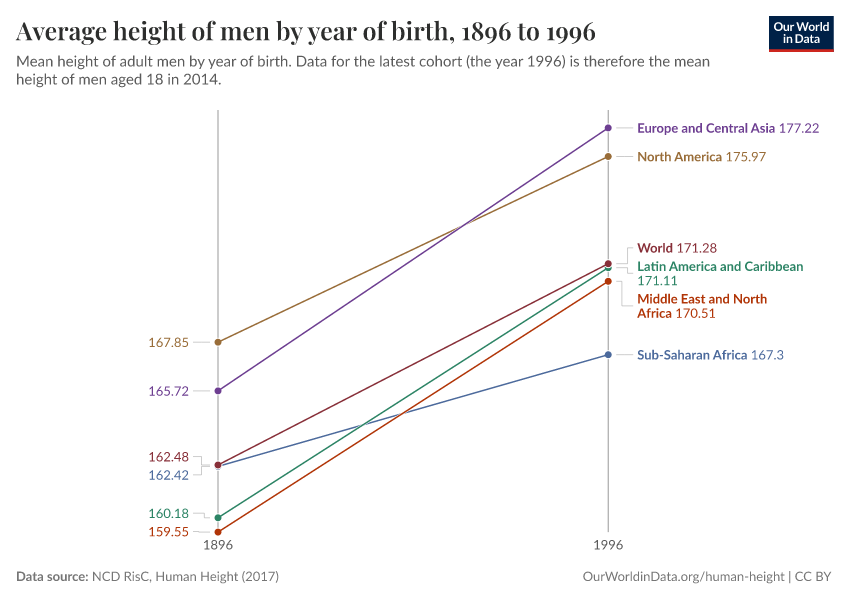 The data shown here comes from a global study, published by the NCD Risk Factor Collaboration (NCD-RisC) in 2016.4 This dataset is based on both demographic and health surveys as well as academic studies. It reports the estimated average (mean) height for adults by their year of birth, meaning that it only includes estimates for those who have reached the age of 18.