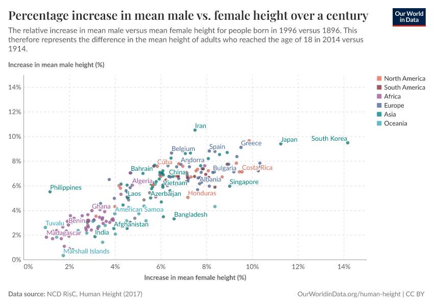 A century ago, South Korean men were on average 18 cm taller than women; this difference fell to 13 cm, meaning that South Korean women saw larger absolute gains in height than South Korean men.