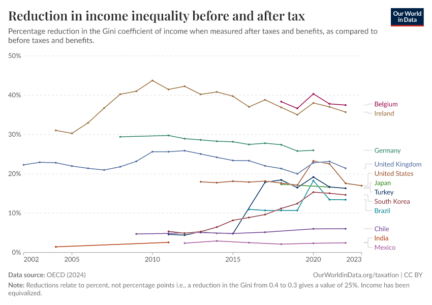 Joe Hasell (2023) - “Income inequality before and after taxes: how much do countries redistribute income?” Published online at OurWorldinData.org. Retrieved from: 'https://gfs-wave-2-new.owid.pages.dev:8789/20260402-163007/income-inequality-before-and-after-taxes.html' [Online Resource] (archived on April 2, 2026).BibTeX citation