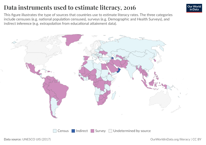 Here, we can see that most countries use sampling instruments (coded as 'Survey' on the map), although in the past census data was more common. Literacy surveys have the potential of being more accurate – when the sampling is done correctly – because they allow for more specific and detailed measurement than short and generic questions in population censuses.