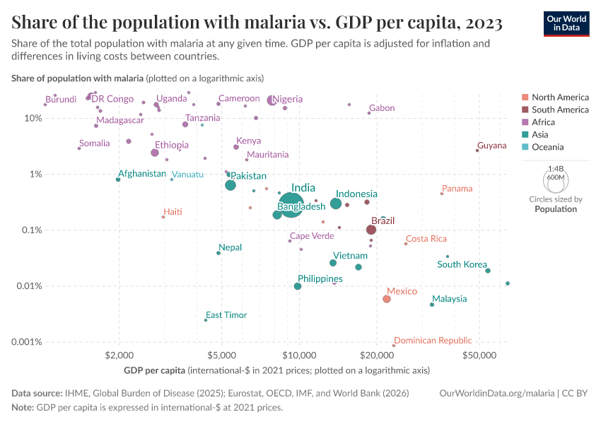 In the chart below, you can see each country’s prevalence of malaria compared to their GDP per capita.