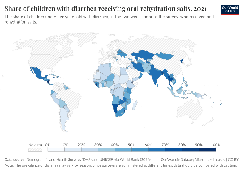 The map below shows the share of children under the age of 5 who received diarrheal treatment in the form of oral rehydration salts.