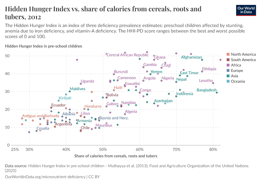 In the chart, you can see the hidden hunger index in children versus the share of dietary energy attained through the consumption of cereals, roots, and tubers.