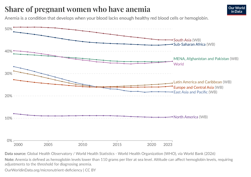 In the chart, we see the prevalence of anemia in pregnant women. Globally, around a third of pregnant women worldwide are anemic.