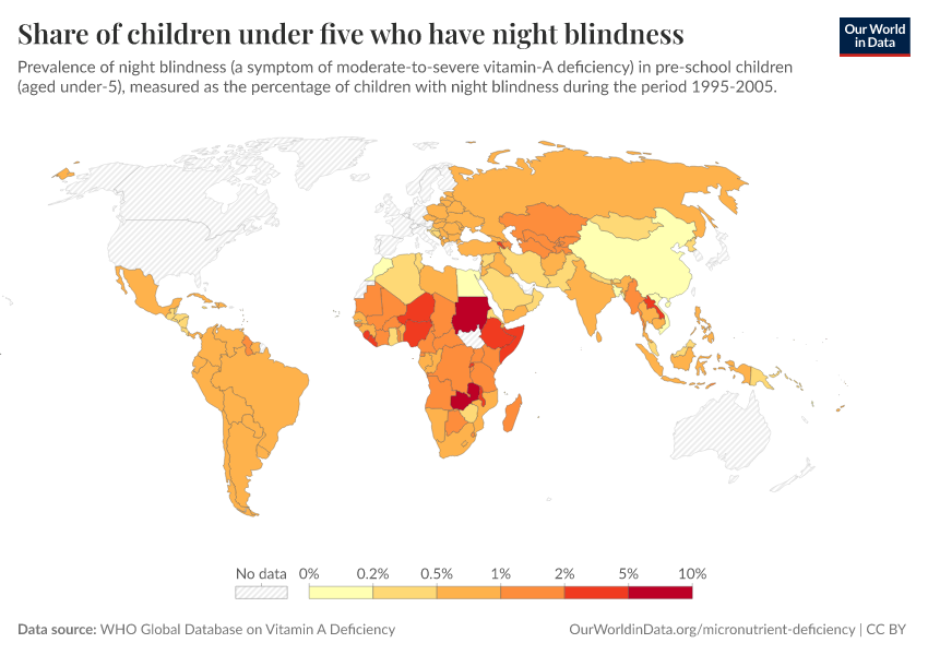 The prevalence of night blindness in most countries is low. However, several countries across sub-Saharan Africa and South Asia record much higher rates.