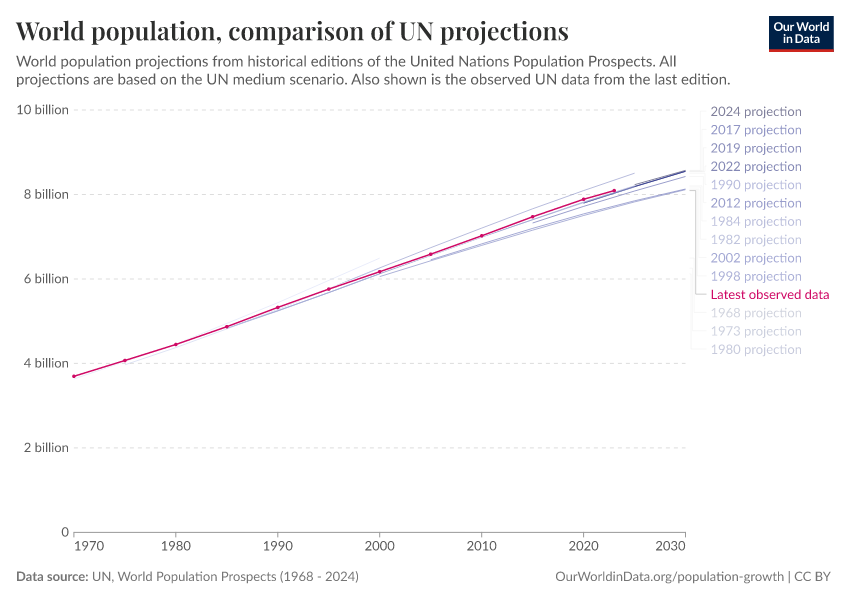 Hannah Ritchie (2023) - “The UN has made population projections for more than 50 years – how accurate have they been?” Published online at OurWorldinData.org. Retrieved from: 'https://gfs-wave-2-new.owid.pages.dev:8789/20260402-163007/population-projections.html' [Online Resource] (archived on April 2, 2026).BibTeX citation