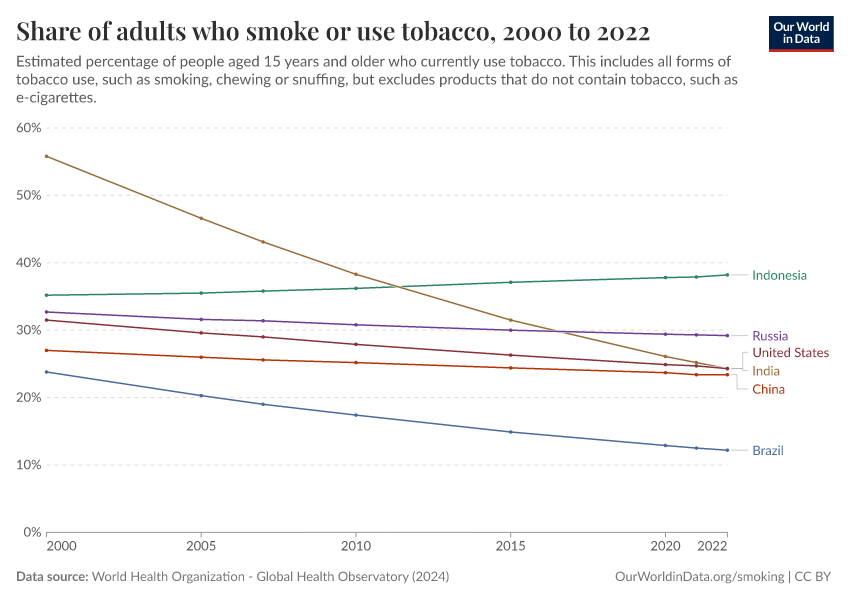 It will remain one of the largest health problems in the world for many years to come. Even after a long decline, about one-in-five adults in the world smokes, and, as we’ve seen above, it takes decades for a reduction in smoking to translate into a reduction of the death rate.
