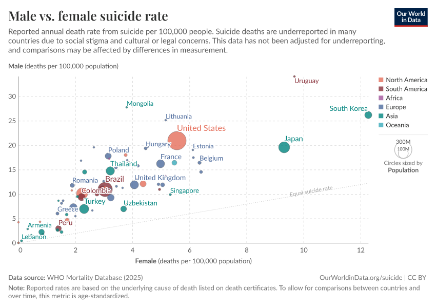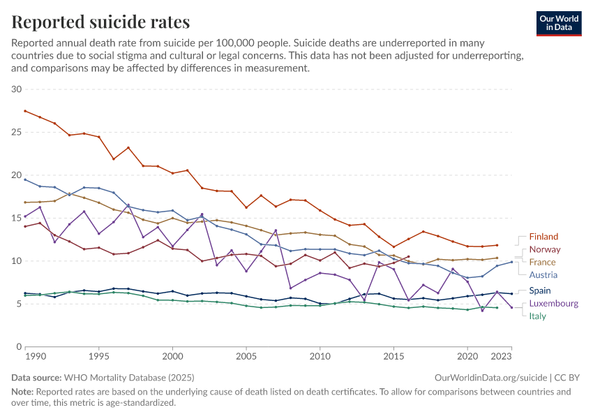Saloni Dattani, Lucas Rodés-Guirao, Hannah Ritchie, Max Roser, and Esteban Ortiz-Ospina (2023) - “Suicides” Published online at OurWorldinData.org. Retrieved from: 'https://gfs-wave-2-new.owid.pages.dev/suicide' [Online Resource]BibTeX citation