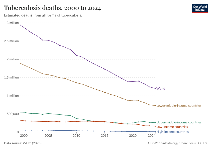 Hannah Ritchie and Fiona Spooner (2025) - “The end of tuberculosis that wasn’t” Published online at OurWorldinData.org. Retrieved from: 'https://gfs-wave-2-new.owid.pages.dev:8789/20260323-160356/the-end-of-tuberculosis-that-wasnt.html' [Online Resource] (archived on March 23, 2026).BibTeX citation